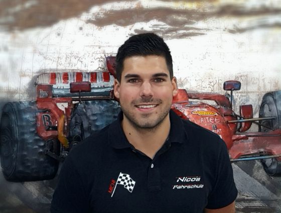 Fröhlich, witziger Fahrlehrer mit lockerer Ausstrahlung.